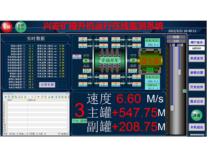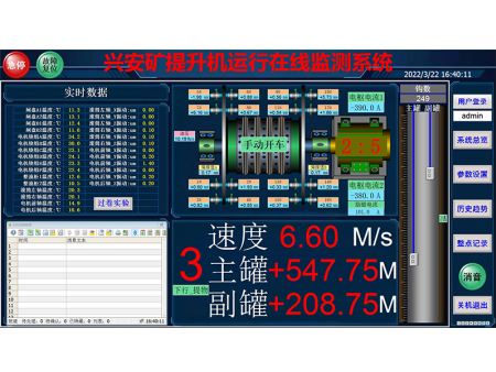 ZTJ127 矿用提升机运行状态监测装置主要用于煤矿提升机的运行参数检测,主要有滚简轴承、减速机轴承、电机轴承的温度振动检测,提升机的运行速度、井深值、方向闭锁、信号闭锁、2m/s 限速、减速报警、过卷保护、闸间隙保护、松绳保护等功能,采用西门子S7-200系列PLC作为主控 CPU,运行安 全可靠,设有10寸彩色显示屏,能够直观的显示提升机的各项运行参数,传感器选用高可靠性元器件,工作性能稳定,该装置能够实时在线检测提升机的各项运行参数,为矿山提升设备保驾护航。